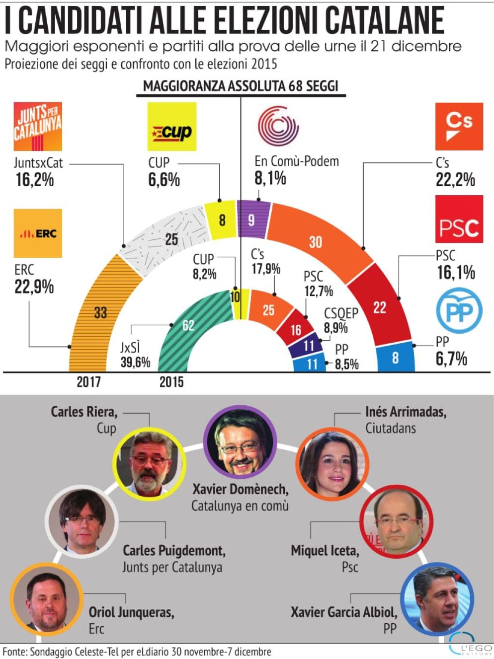 In questo senso, la battaglia di oggi – quando 5,5 milioni di catalani sceglieranno il proprio esecutivo – conclude quella iniziata, sempre di giovedì, il 26 ottobre, quando Puigdemont e Junqueras si scontrarono sull’alternativa tra andare alle urne o procedere con lo strappo dalla Spagna. Non è un segreto che l’ex presidente incolpi Esquerra – «responsabile» di aver spinto sul- l’acceleratore – del caos degli ultimi mesi. Eppure, nonostante, gli evidenti problemi, i sondaggi danno al versante secessionista – inclusa l’ultrasinistra della Candidatura d’unitat popular (Cup) – circa la metà dei consensi.