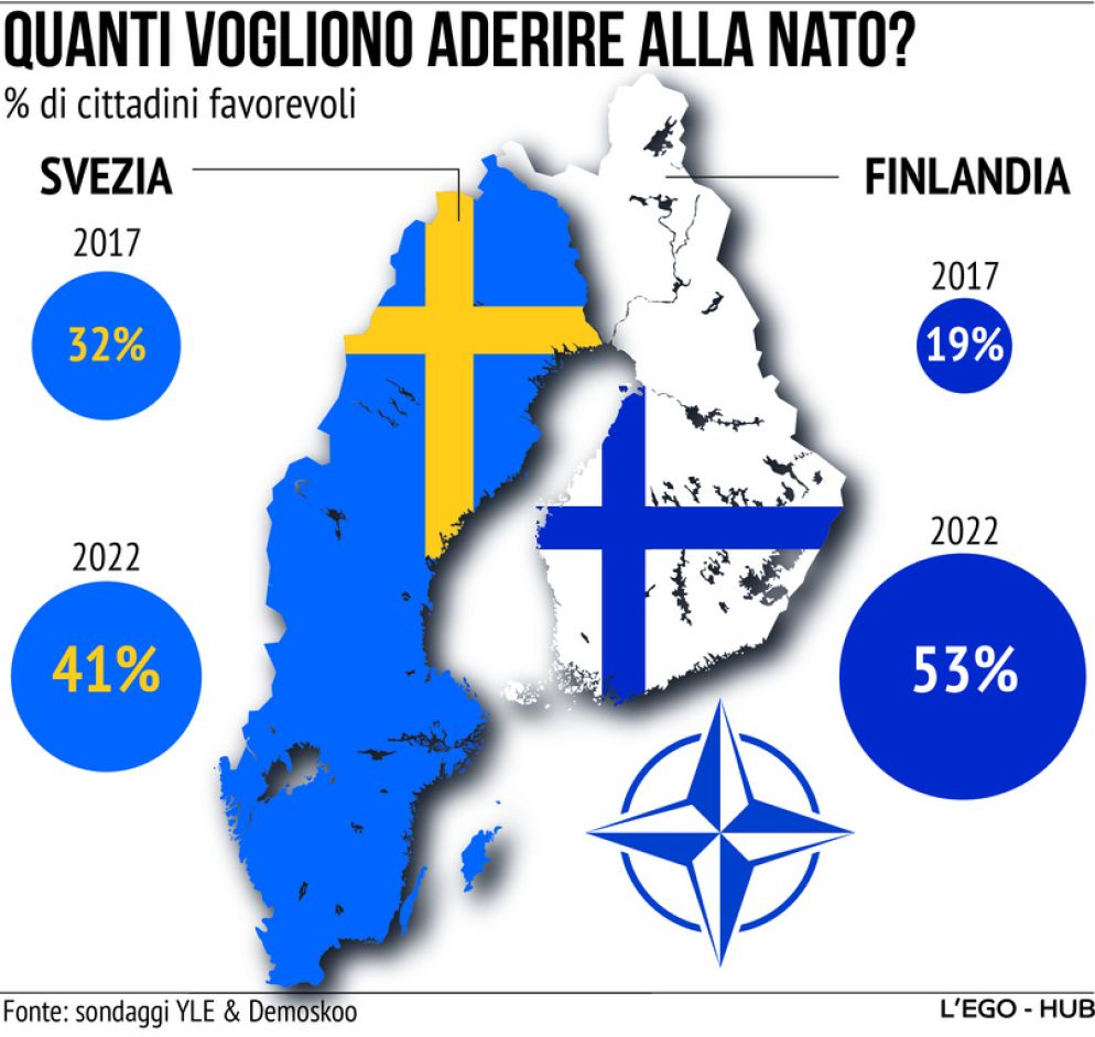 Mosca contro l'adesione alla Nato di Finlandia e Svezia mentre il Pentagono annuncia l'invio di armi a Kiev in una settimana. Per il Cremlino, con l'adesione dei due paesi alla Nato "cambierebbe radicalmente la situazione politico-militare". E annuncia che si difenderà con "conseguenze tra le più indesiderabili" perché "il Baltico non sarà più considerato non nucleare".