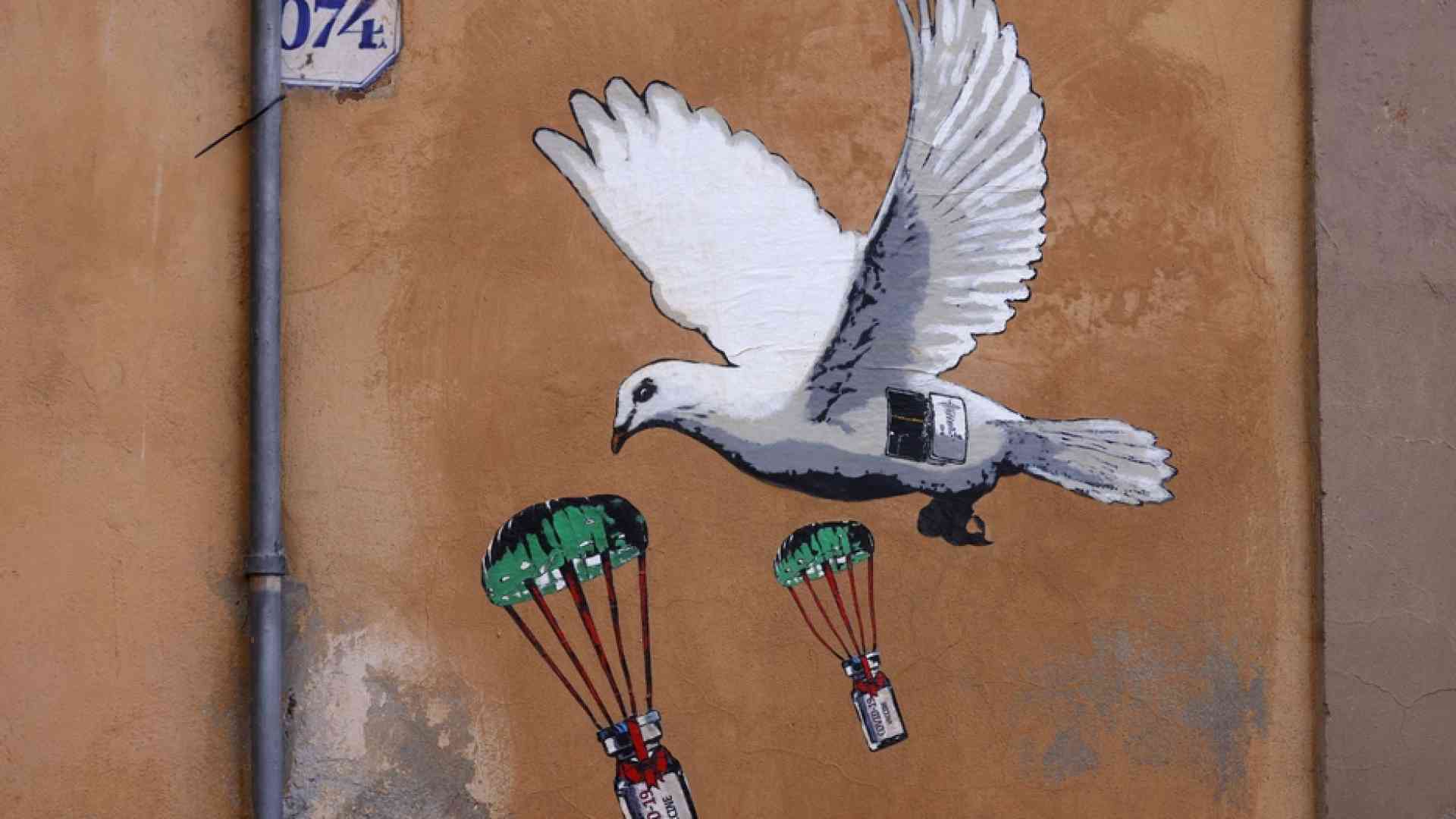 Sui muri del ministero della Salute è comparso stamani un disegno dell'artista Harry Greb: rappresenta una colomba che porta dei vaccini e sul corpo ha un portellone d'aereo aperto, con due flaconi di vaccino anti-Covid che scendono con un paracadute.