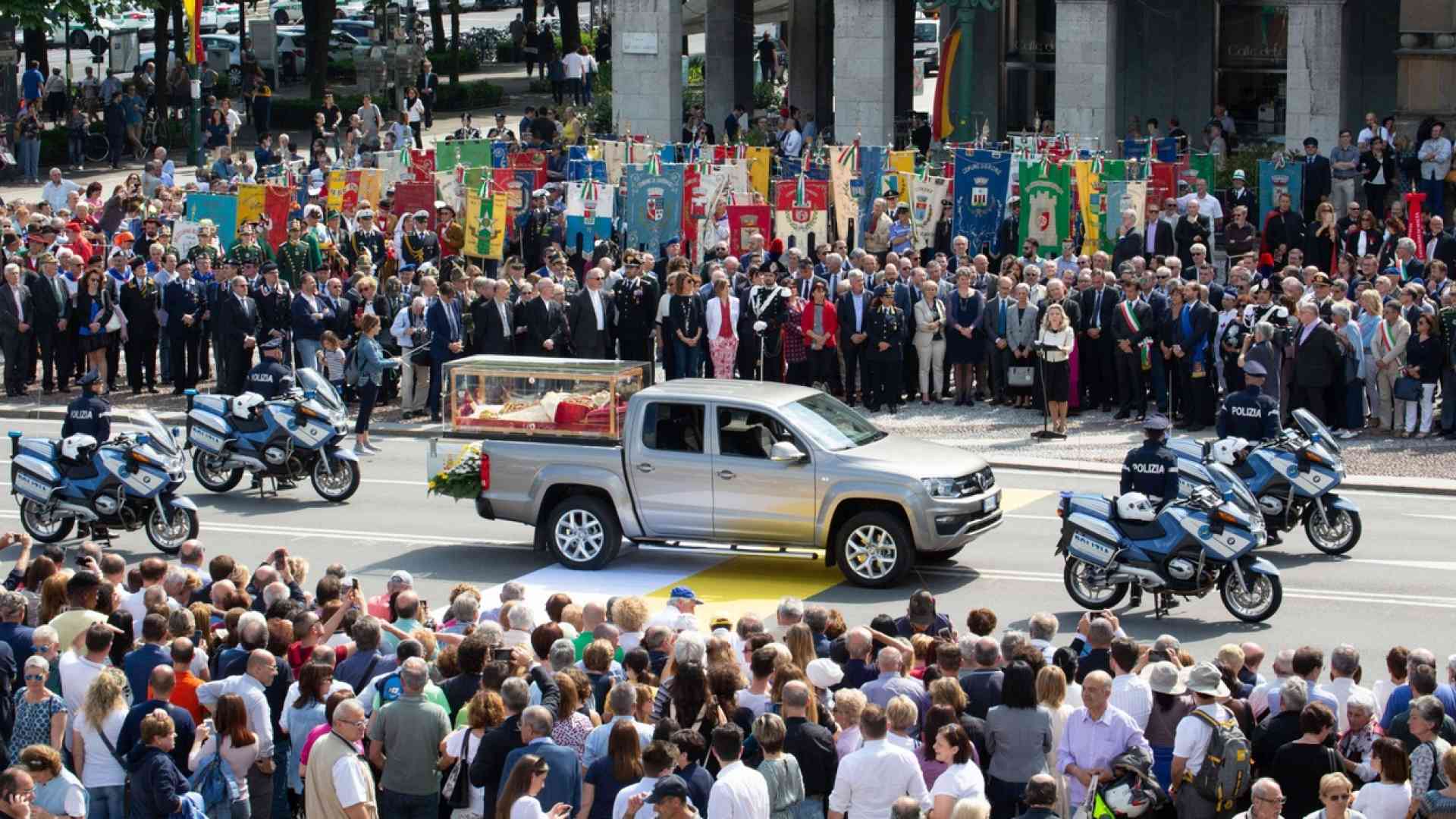 L'urna arriva a Bergamo in piazza Vittorio Veneto (Frau)