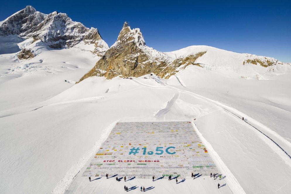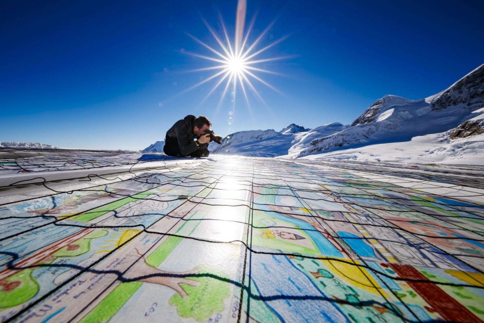 L’opera è posta sul ghiacciaio dell’Aletsch ad un’altitudine di 3.400 metri vicino allo Jungfraujoch nelle Alpi svizzere e supera il precedente record mondiale di cartoline giganti. Il mosaico, di 2.500 metri quadrati, è stato posato sulla neve per promuovere un movimento internazionale giovanile per il clima in vista della prossima conferenza globale sul clima (Cop24) in Polonia. Lo ha spiegato la fondazione Wave, che ha organizzato l’evento in collaborazione con le autorità svizzere.