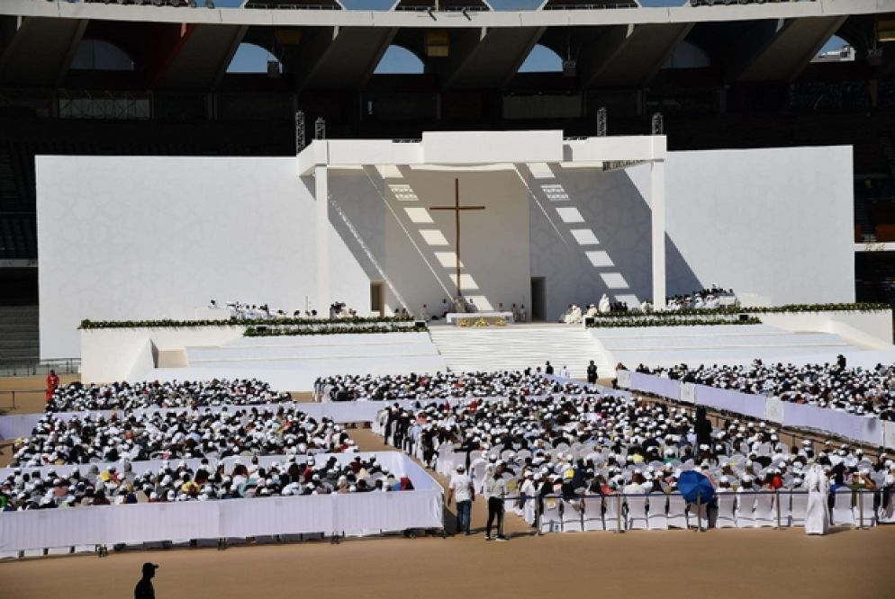 «Con quella bella fraternità per cui non ci sono cristiani di prima e di seconda classe… il cristiano promuove la pace, a cominciare dalla comunità in cui vive…». Allo Zayed Sports City di Abu Dhabi 43mila cattolici d’ogni nazionalità e di diversi riti affollano gli spalti, almeno altri 90mila hanno atteso papa Francesco all’esterno sotto un cielo ventoso e note di musica classica. Non mancano, mischiati tra i fedeli, anche 4 mila musulmani con il loro tradizionale thawb bianco e le donne islamiche avvolte nei loro shila neri per la più grande Messa in luogo pubblico mai celebrata prima nella Penisola arabica. Nel Paese, che con la costituzione del 1971 definisce l’islam come religione ufficiale e la Sharia rappresenta la sorgente principale della legislazione civile, il governo, come aveva annunciato il ministero delle Risorse Umane degli Emirati Arabi Uniti – ha dichiarato questa giornata festiva concedendo permessi per partecipare alla Messa papale. Francesco è arrivato al mattino tra questa cristianità multilingue e multicolore d’immigrati, cresciuta sotto lo spazio della tolleranza e le guide delle comunità cattoliche che hanno sempre condiviso e fatto proprio lo stesso approccio realista e non antagonista nei confronti dell’ordine costituito di fattura islamica. Sono loro i «beati» a cui si rivolge quando sul palco prende la parola nell’omelia.