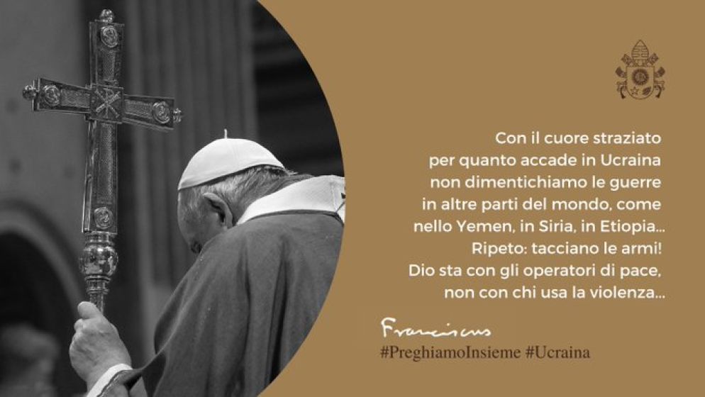 Francesco ha rilanciato l’appello domenica scorsa dopo la recita dell’Angelus, quando la guerra scatenata dalla Russia di Vladimir Putin ha cominciato a mietere vittime, anche tra i civili.