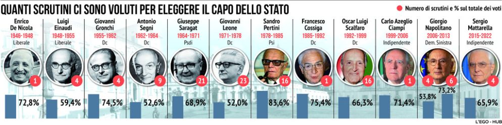 Bastò un solo scrutinio per eleggere presidente della Repubblica Francesco Cossiga e Carlo Azeglio Ciampi, mentre ben 23 votazioni servirono per Giovanni Leone, che resta il Presidente eletto con la percentuale più bassa, il 51% delle preferenze. Il recordman di voti è stato invece Sandro Pertini, eletto con 82% di consensi.
