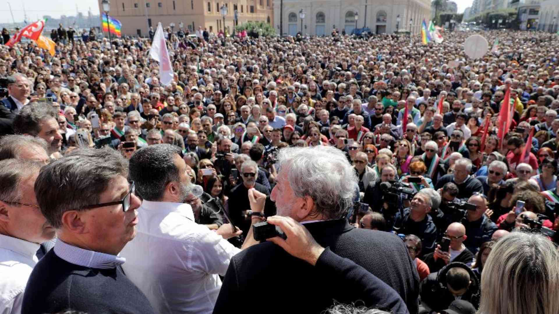 Accanto a lui anche il governatore della Puglia, Michele Emiliano, che ricorda «quello che la Puglia è diventata in questi venti anni», spiegando che «hanno bisogno di questa ispezione, che non è un atto dovuto, per costruirci su una campagna elettorale». In piazza, fra esponenti della politica locale e nazionale, anche la vice presidente del Parlamento europeo, Pina Picierno, a Bari «per stringere con un abbraccio popolare il suo sindaco, che è un amministratore perbene». Dal palco è il presidente di Libera Puglia, don Angelo Cassano, ad andare giù duro dando del «criminale» al ministro Piantedosi.