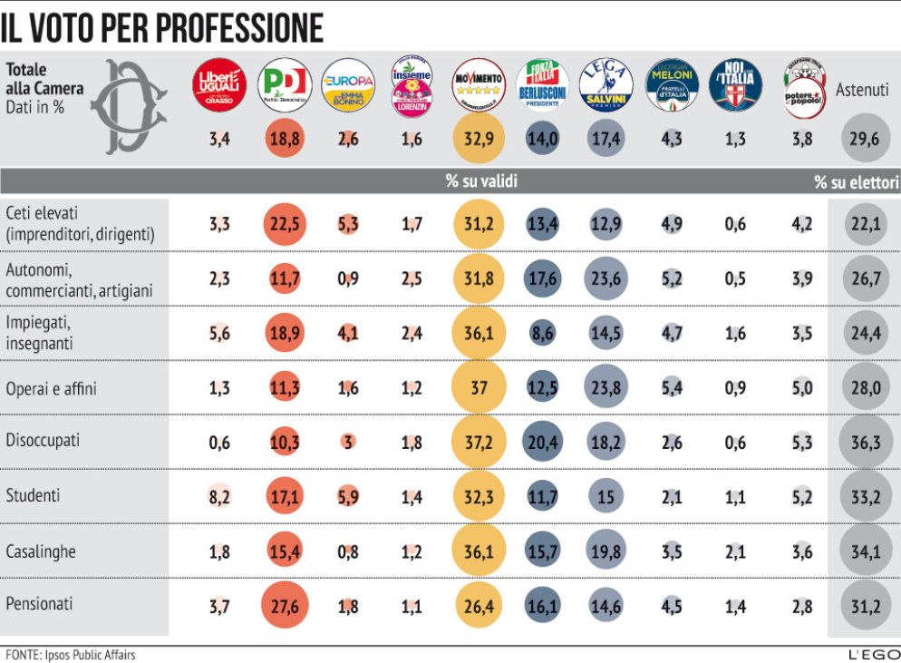 I disoccupati tornano a premiare la Lega con il 18,2% (in questa categoria, però, come per i pensionati, il Carroccio è dietro a Forza Italia, al 20,4%) e M5S che si attesta al 37,2%. Mentre gli studenti regalano al partito di Pietro Grasso un lusinghiero 8,2%, con il Pd al 17,1%, la Lega al 15% e M5s al 32,3%. Se si analizza il voto solo a partire dal titolo di studio, M5s scende sotto il 30% solo tra i laureati (29,3%), sempre ben al di sopra del Pd (21,8%), partito che arriva al proprio risultato più alto (25,2%) tra chi ha la licenza elementare. Il secondo posto, sempre dietro M5s, la Lega lo guadagna tra chi ha la licenza media (22,4%).