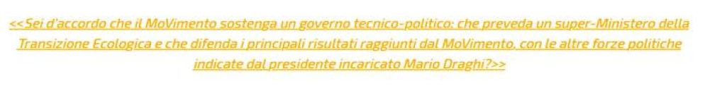 I sì per l'appoggio al governo di Mario Draghi sulla piattaforma Rousseau sono stati 44.167, con una percentuale del 59,3 per cento. I voti contrari sono stati 30.360 contrari, pari al 40,7 per cento. È stato il notaio Valerio Tacchini a fornire l'esito del voto online degli iscritti del Movimento cinque stelle alla piattaforma Rousseau che oggi, dalle 10 alle 18 si sono espressi sul via libera al nuovo esecutivo guidato da Draghi.