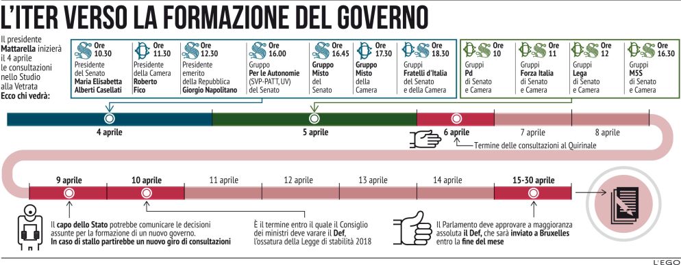 Al via mercoledì mattina le consultazioni del presidente della Repubblica, Sergio Mattarella, per verificare tempi e modalità per dar vita a un nuovo governo dopo le elezioni del 4 marzo scorso.