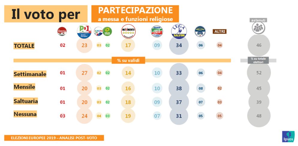 Fra i praticanti assidui è cresciuta decisamente l’astensione (52%), ha vinto la Lega (33%), seguita dal Pd (27%), crolla M5s (14%)