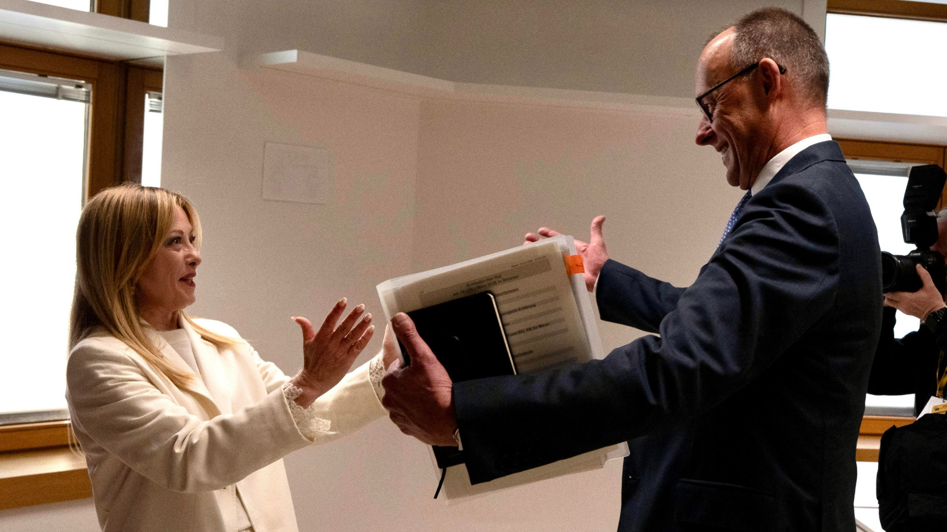 Il saluto a Bruxelles tra Meloni e Merz/ ANSA