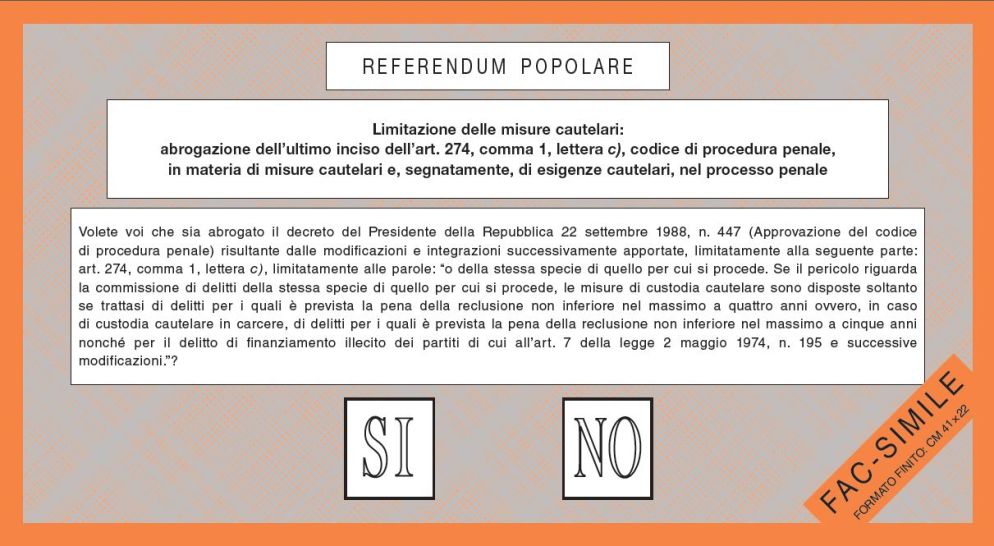 Per il secondo referendum, la scheda è arancione. In questo caso, i proponenti chiedono di limitare i casi di applicazione delle misure cautelari (le restrizioni di libertà come custodia in carcere o ai domiciliari, obbligo di firma e altre a cui un indagato può esser sottoposto prima di una sentenza). A elencare i presupposti per l'applicazione delle misure cautelari (pericolo di fuga, rischio di inquinamento delle prove o di reiterazione del reato da parte dell'indagato) è l'articolo 274 del codice di procedura penale. Il quesito propone di abrogare l’ultima parte del suddetto articolo, in cui si prevede la possibilità, anche per reati di minor gravità, di motivare la custodia preventiva con il pericolo di reiterazione, motivazione usata di frequente - sostengono i promotori del referendum - per trattenere gli indagati anche a lungo prima di una sentenza di condanna o di assoluzione. Resterebbe comunque la misura cautelare per i reati più gravi. Ma chi difende le ragioni del no, ritiene che per diverse tipologie di reato (come la truffa, alcuni crimini fiscali o anche lo stalking) il rischio di reiterazione esista e dunque la custodia cautelare abbia un senso.