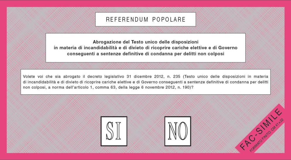Per il referendum numero 1, la scheda è di colore rosso. La richiesta dei proponenti è di abrogare il Testo unico del 2012 in materia di incandidabilità e di divieto di ricoprire cariche elettive e di governo, noto come legge Severino (dal cognome della Guardasigilli all'epoca del governo Monti). Quel testo prevede il divieto di ricoprire incarichi di governo e l'ineleggibilità o incandidabilità a elezioni politiche o amministrative (a pena di decadenza) per chi viene condannato in via definitiva per corruzione o altri gravi reati. Secondo i promotori del referendum, una parte di quel meccanismo è inefficace e dannosa per le persone coinvolte, laddove prevede la sospensione di sindaci e amministratori locali anche in caso di sentenze non definitive. Tuttavia, l'abrogazione comporterebbe la cancellazione dell'intero testo. Chi viene condannato con sentenza definitiva potrebbe proseguire il mandato o ricandidarsi. E tornerebbe in capo alla magistratura stabilire se applicare o meno la pena accessoria dell'interdizione dai pubblici uffici. Secondo il costituzionalista e parlamentare del Pd Stefano Ceccanti, si tratta del «quesito intimamente più contraddittorio, poiché esiste il problema reale delle sospensioni di amministratori locali e regionali per sentenze non definitive, spesso smentite nei gradi successivi, che andrebbe eliminato. Ma il quesito elimina per intero anche la decadenza e l’incandidabilità per le sentenze definitive». Inoltre, la riforma Cartabia non interviene su questo punto.