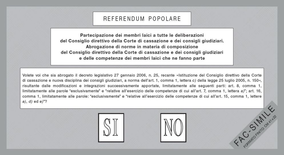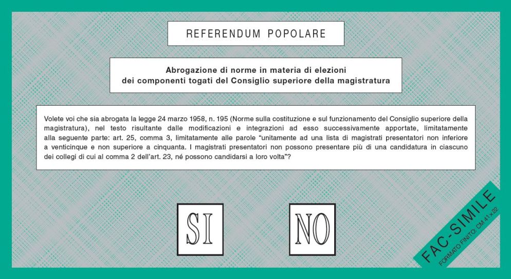 Nell'ultimo referendum, la scheda è verde. Il quesito si propone di incidere sulle norme in materia di elezione dei membri togati del Consiglio superiore della magistratura, organo di autogoverno dei 10mila magistrati italiani. A parte i tre membri di diritto (presidente della Repubblica, primo presidente e procuratore generale della Cassazione), gli altri componenti vengono eletti ogni quattro anni, che siano togati (ossia provenienti dalla magistratura e votati dalla stessa) o laici (esperti di diritto, votati dal Parlamento). Attualmente, per candidarsi al Csm, un magistrato deve depositare una lista di almeno 25 firme di colleghi. Una eventuale vittoria del sì cancellerebbe la raccolta di firme e riporterebbe in vigore la normativa del 1958, secondo la quale qualunque magistrato può autonomamente e liberamente candidarsi. Ciò, affermano i proponenti, indebolirebbe il potere delle cosiddette "correnti", i gruppi con orientamento politico rappresentati nel "parlamentino" dell'Associazione nazionale magistrati. Ma i sostenitori del no ritengono che la cancellazione delle firme di lista abbia una valenza limitata contro le degenerazioni del correntismo, mentre l'articolo 33 dell'attuale riforma del Csm, contenuta nel pacchetto Cartabia, potrebbe avere un'incisività ben maggiore.
