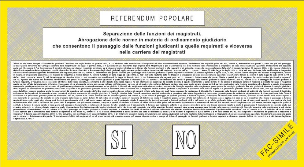 In questo caso, la scheda è di colore giallo. Il referendum ha al centro la separazione delle carriere dei magistrati e propone di eliminare quelle disposizioni che consentono (per quattro volte, al massimo) la possibilità di passare dalla funzione requirente (il sostituto procuratore, che avvia e conduce le indagini e che, come pubblico ministero, rappresenta l'accusa nel processo) e a quella giudicante, incarnata dal giudice super partes, che emette la sentenza. Chi propone il sì, ritiene che le due funzioni debbano essere nettamente separate: chi entra in magistratura dovrebbe scegliere all'inizio della carriera il ruolo, requirente o giudicante, senza la possibilità di cambiare in seguito. Sulla questione, è contenuta una previsione anche nella riforma Cartabia, l'articolo 12 che va nella medesima direzione senza azzerare i passaggi, ma riducendoli dagli attuali quattro a uno.