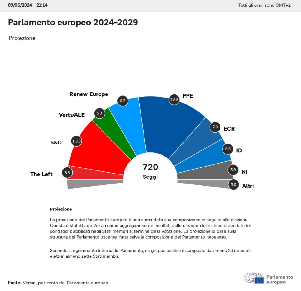 Secondo le prime stime del Parlamento europeo, i Popolari sono in testa in Germania, Cipro, Grecia, Bulgaria, Croazia, mentre in Olanda e Austria al primo posto sono gli euroscettici di Id. A Malta primi sono i Socialisti, in Danimarca primi sono i liberali-macroniani di Renew. Secondo le prime stime appena diffuse dal Parlamento europeo, se non c’è un trionfo dell’estrema destra paragonabile a quanto accaduto in Germania e in Austria, c’è comunque un’avanzata. Un elemento importante va tenuto conto: il raffronto rispetto al 2019 considera l’aumento dei seggi (dovuto a una modifica che riflette le modifiche demografiche di alcuni Stati membri) dai 705 di cinque anni fa ai 720 attuali. Detto questo, il Ppe potrebbe guadagnare 12 seggi rispetto al 2019, per arrivare a 186 seggi. In calo invece i socialisti, che perderebbero 6 seggi per fermarsi a 133. Tra i grandi perdenti i Verdi, che calerebbero di 18 seggi per attestarsi a 53 eurodeputati. Anche i liberali e macroniani di Macron vedono una perdita di 20 seggi (82 seggi).