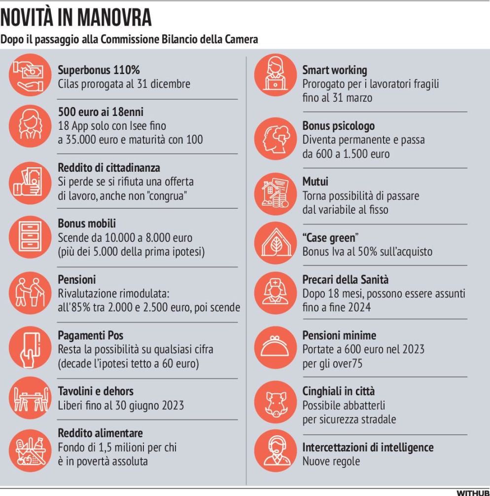 Il testo approvato dalla commissione Bilancio specificava che le due Carte venivano finanziate nel limite massimo di spesa di 190 milioni di euro annui a decorrere dal 2024. Dopo il «rilievo», il governo è costretto ad ammettere che sulle coperture aveva ragione il “papà” di 18App, Matteo Renzi. Inoltre, nel 2023, i nati nel 2004 accederanno al bonus con il vecchio regime universale. Tra le misure da cambiare spicca quella relativa alla proroga dello smart working. La Rgs ha infatti espresso perplessità soprattutto sulla scuola e sulla sostituzione del personale scolastico a cui è concesso il lavoro agile. La manovra prevede infatti che i lavoratori pubblici e privati fragili possano usufruire dello smart working fino al 31 marzo 2023, dando loro tre mesi in più rispetto all’attuale scadenza fissata per il 31 dicembre.