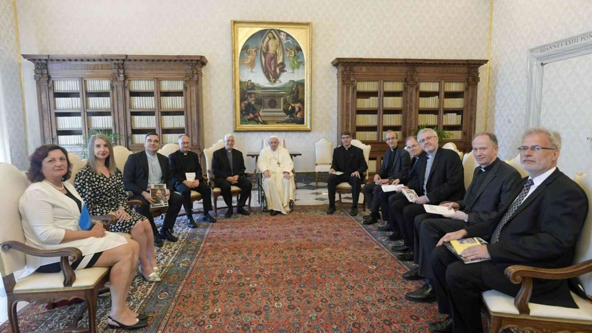 Lo scorso 19 maggio il Papa ha incontrato i direttori delle riviste culturali europee della Compagnia di Gesù raccolti in udienza presso la Biblioteca privata del Palazzo apostolico. Erano dieci i direttori: padre Stefan Kiechle di “Stimmen der Zeit” (Germania), Lucienne Bittar di “Choisir” (Svizzera), padre Ulf Jonsson di “Signum” (Svezia), padre Jaime Tatay di “Razón y fe” (Spagna), padre José Frazão Correia di “Brotéria” (Portogallo), padre Pawel Kosinski di “Deon” (Polonia), padre Arpad Hovarth di “A Szív” (Ungheria), Robert Mesaros di “Viera a život” (Slovacchia), Frances Murphy di “Thinking Faith” (Regno Unito) e padre Antonio Spadaro de “La Civiltà Cattolica”. Tre direttori erano laici, di cui due donne (per la rivista svizzera e quella inglese). Gli altri erano gesuiti. Accogliendoli il Papa ha scherzato sul fatto di essere in sedia a rotelle a causa dei dolori al ginocchio: «Benvenuti! Vedete? Sono nella mia nuova sedia gestatoria». L’incontro con il Pontefice è stato l’avvio dell’incontro annuale dei direttori. All’udienza ha partecipato anche il preposito generale della Compagnia di Gesù, padre Arturo Sosa.