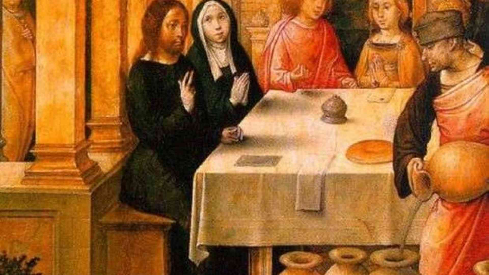 In quel tempo, vi fu una festa di nozze a Cana di Galilea e c'era la madre di Gesù. Fu invitato alle nozze anche Gesù con i suoi discepoli. Venuto a mancare il vino, la madre di Gesù gli disse: «Non hanno vino». E Gesù le rispose: «Donna, che vuoi da me? Non è ancora giunta la mia ora». Sua madre disse ai servitori: «Qualsiasi cosa vi dica, fatela». [...]