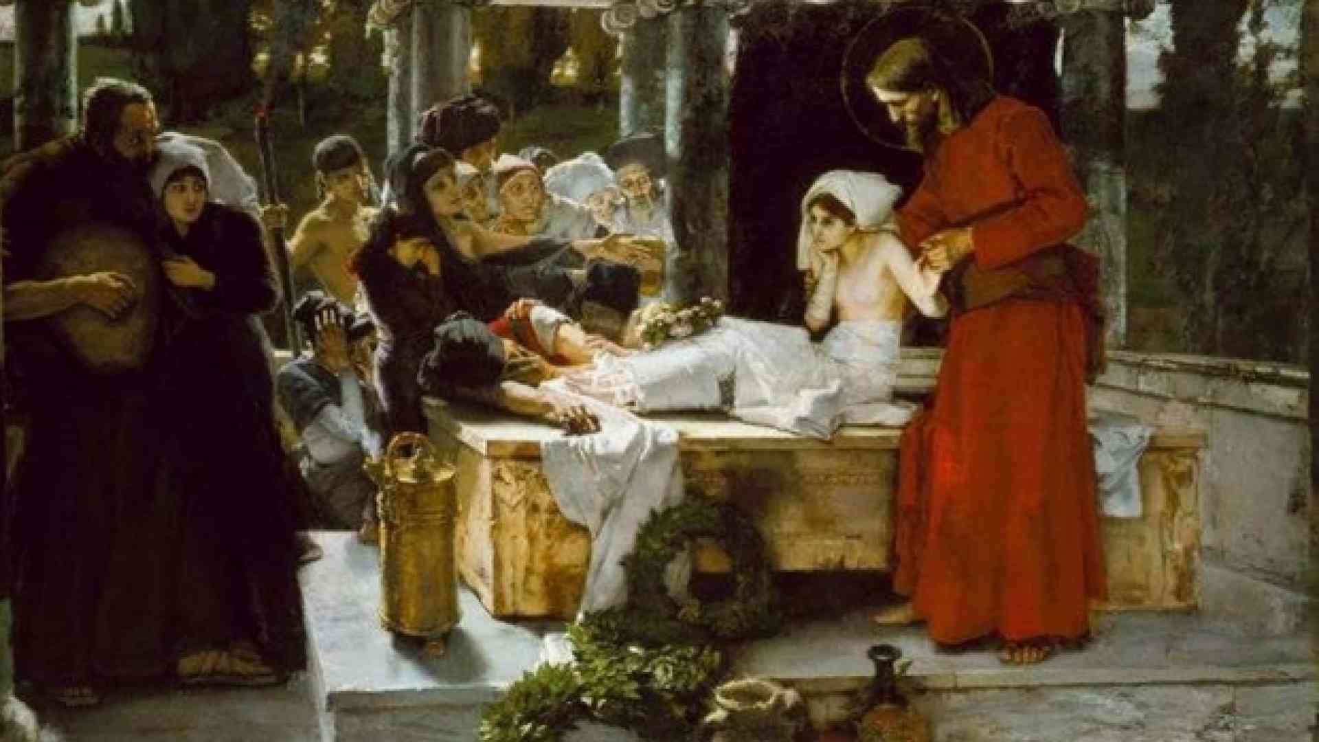 In quel tempo, essendo Gesù passato di nuovo in barca all'altra riva, gli si radunò attorno molta folla ed egli stava lungo il mare. E venne uno dei capi della sinagoga, di nome Giairo, il quale, come lo vide, gli si gettò ai piedi e lo supplicò con insistenza: «La mia figlioletta sta morendo: vieni a imporle le mani, perché sia salvata e viva». Andò con lui. Molta folla lo seguiva e gli si stringeva intorno. Dalla casa del capo della sinagoga vennero a dire: «Tua figlia è morta. Perché disturbi ancora il Maestro?». Ma Gesù, udito quanto dicevano, disse al capo della sinagoga: «Non temere, soltanto abbi fede!». E non permise a nessuno di seguirlo, fuorché a Pietro, Giacomo e Giovanni, fratello di Giacomo [...].