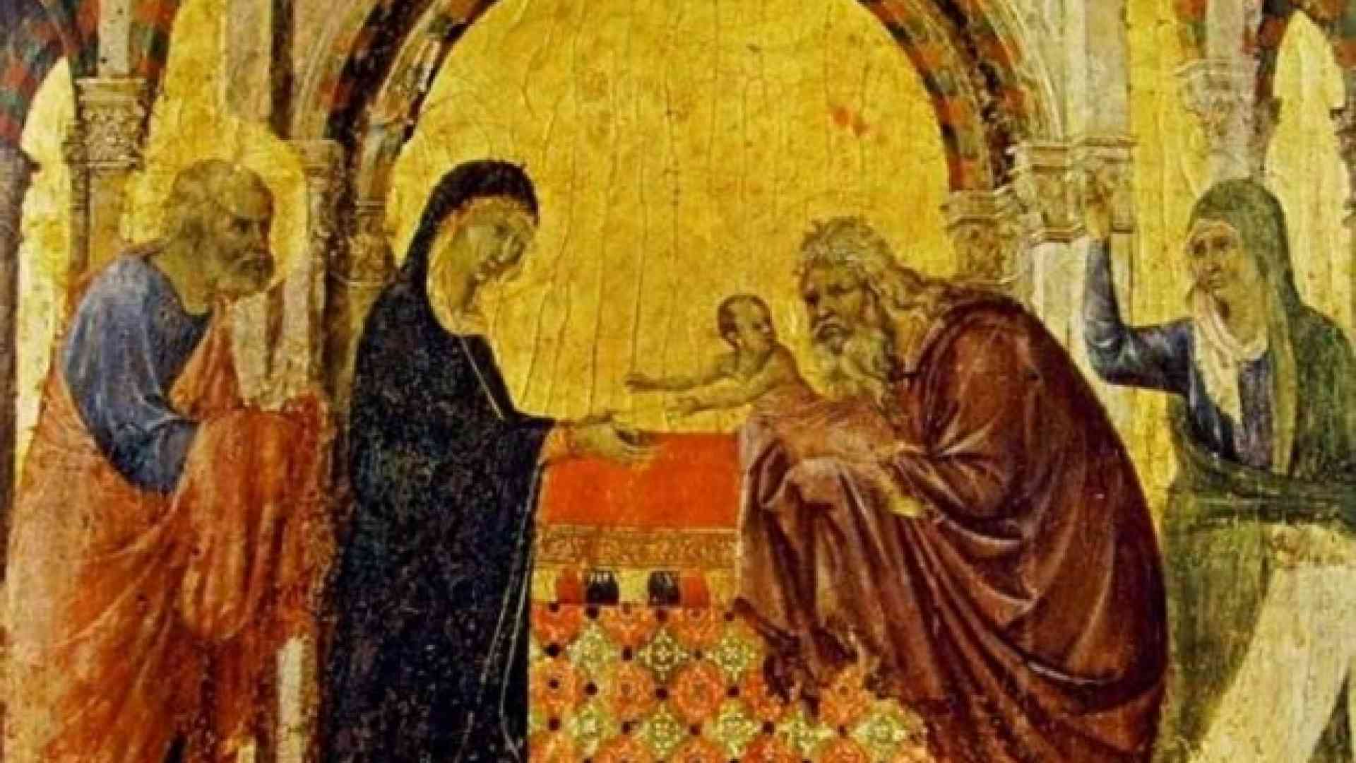 Quando furono compiuti i giorni della loro purificazione rituale, secondo la legge di Mosè, [Maria e Giuseppe] portarono il bambino [Gesù] a Gerusalemme per presentarlo al Signore – come è scritto nella legge del Signore: «Ogni maschio primogenito sarà sacro al Signore» – e per offrire in sacrificio una coppia di tortore o due giovani colombi, come prescrive la legge del Signore. Ora a Gerusalemme c'era un uomo di nome Simeone, uomo giusto e pio, che aspettava la consolazione d'Israele, e lo Spirito Santo era su di lui. Lo Spirito Santo gli aveva preannunciato che non avrebbe visto la morte senza prima aver veduto il Cristo del Signore. [...]