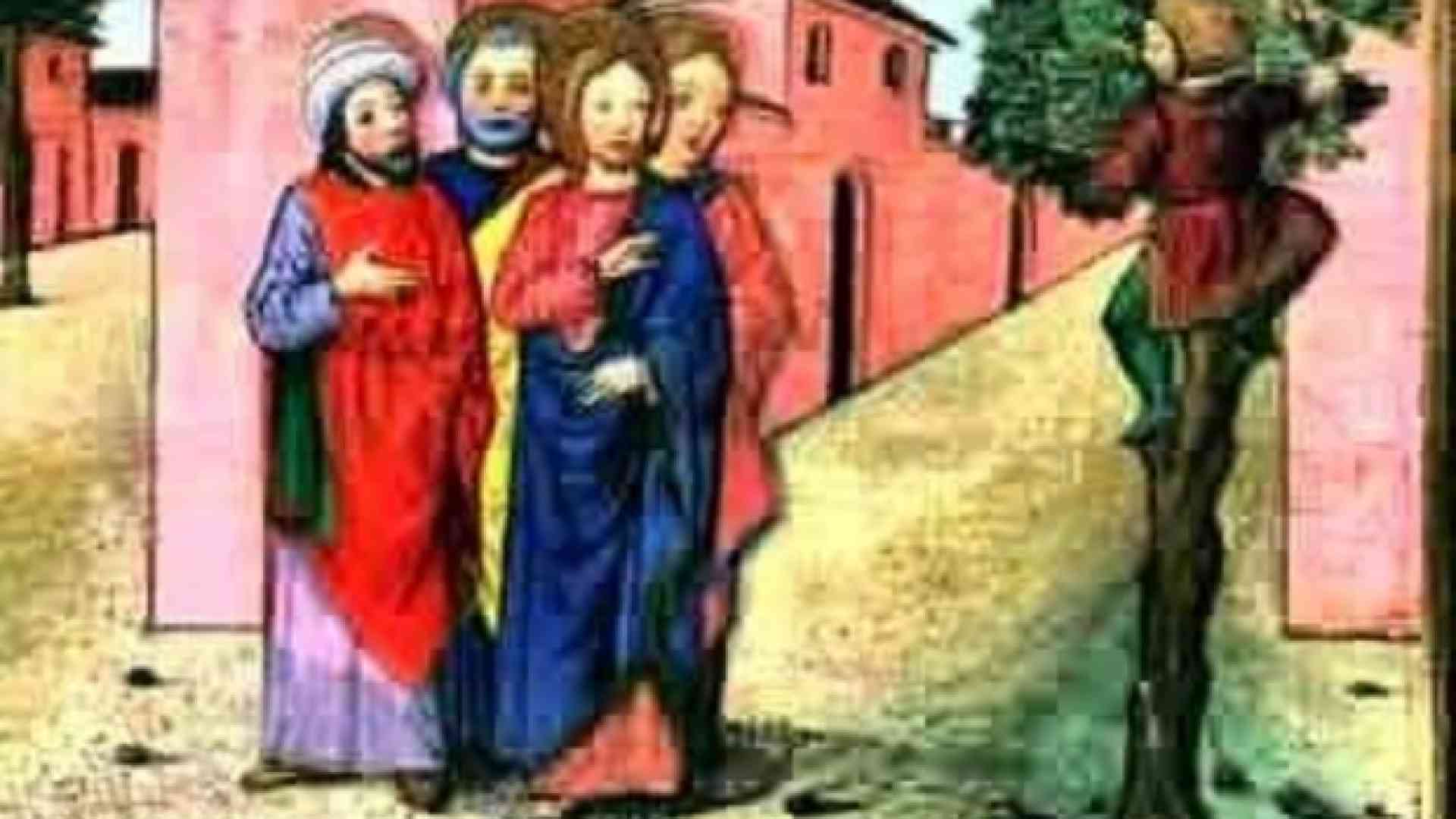 In quel tempo (...) un uomo, di nome Zacchèo, capo dei pubblicani e ricco, cercava di vedere chi era Gesù, ma non gli riusciva a causa della folla, perché era piccolo di statura. Allora corse avanti e, per riuscire a vederlo, salì su un sicomòro (...). Gesù alzò lo sguardo e gli disse: «Zacchèo, scendi subito, perché oggi devo fermarmi a casa tua». Scese in fretta e lo accolse pieno di gioia. Vedendo ciò, tutti mormoravano: «È entrato in casa di un peccatore!». Ma Zacchèo, alzatosi, disse al Signore: «Ecco, Signore, io do la metà di ciò che possiedo ai poveri e, se ho rubato a qualcuno, restituisco quattro volte tanto» (...)