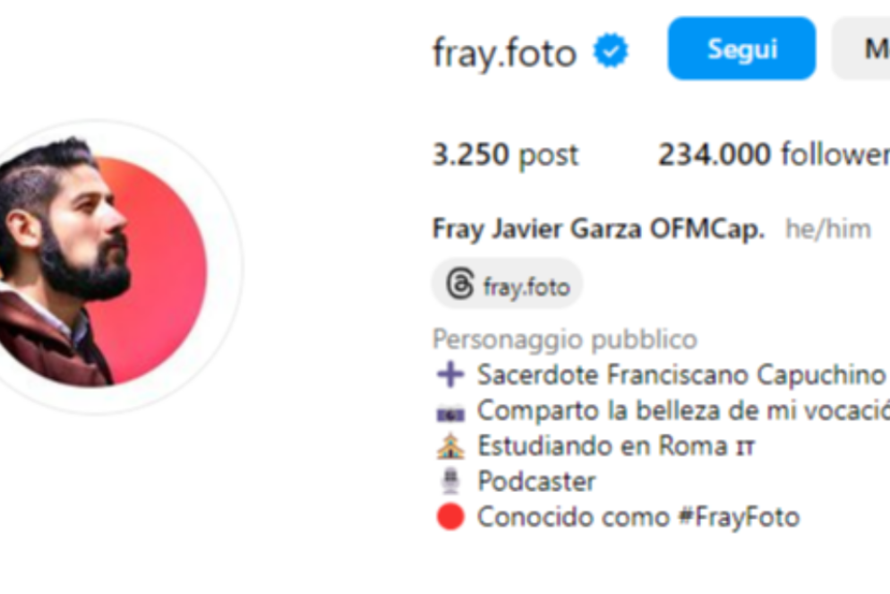 Si può fare missione digitale anche postando belle immagini, come quelle di fray Javier Garza. Cappuccino, 39 anni, originario di Monterrey (Messico), ordinato presbitero nel 2019, attualmente a Roma per completare la formazione, non gli mancano gli studi teologici, ma su Facebook si qualifica innanzitutto come digital creator, mentre nella biografia sull’home page del suo semplice sito personale aggiunge che da 14 anni è appassionato di fotografia, con la quale cerca di «catturare i momenti più belli della vita religiosa» nonché «paesaggi in genere». Anzi, si dice proprio «fissato» con gli elementi di «luce, ombra, composizione ed emozione» che fanno grande una fotografia. Va da sé che, pur avendo iniziato su Twitter (dove ha tuttora 83mila follower), il social network sul quale va più forte oggi sia Instagram: lo si incontra all’account @fray.foto, dove ha radunato finora la bella cifra di 234mila iscritti.
