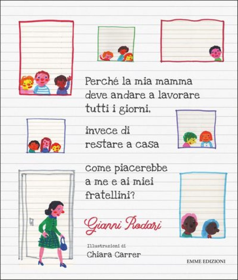 Un titolo chilometrico per questo albo che cade a fagiolo nell’avvicinarsi della festa sempre a calendario della mamma, Perché la mia mamma deve andare a lavorare tutti i giorni, invece di restare a casa come piacerebbe a me e ai miei fratellini? Pubblicato da Emme Edizioni (14,90 euro) con le illustrazioni dal segno infantile di Chiara Carrer, queste pagine sono tratte dalla raccolta de “Il libro dei perché” di Gianni Rodari, uscito postumo nel 1984. Dall’agosto del 1955 con alcune interruzioni fino al giugno 1958 Rodari tenne una rubrica settimanale su l’Unità in cui rispondeva alle lettere con le domande dei bambini che gli ponevano.