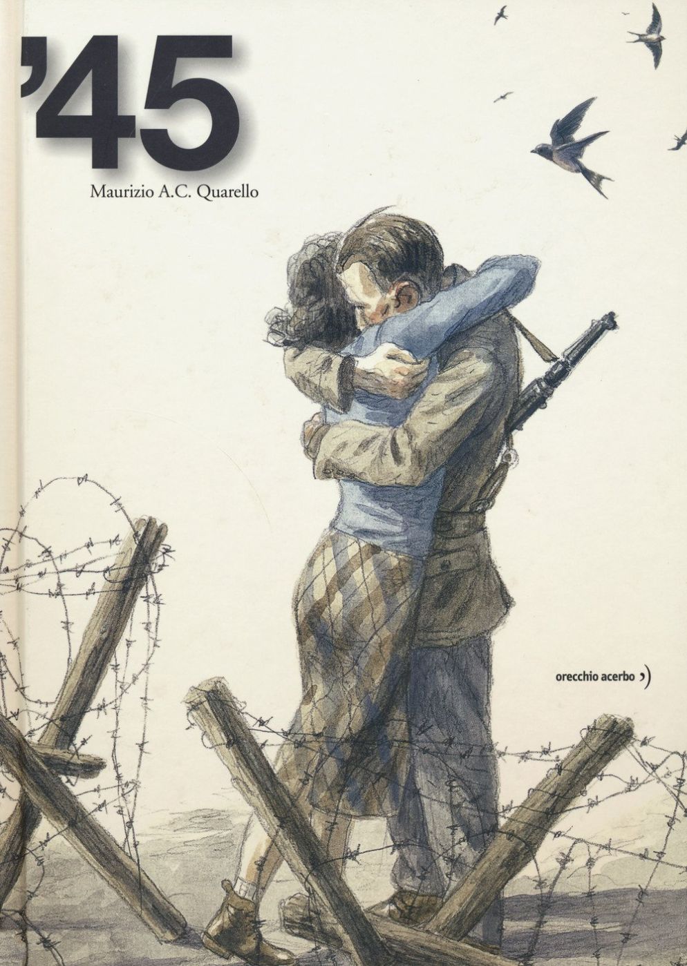 Novantasei pagine, con illustrazioni a matita acquerellate, nessuna parola. Silent book e grafic novel contemporaneamente, ’45 (Orecchio Acerbo; 19 euro) è una storia di guerra e di liberazione, di violenze e teneri abbracci, di soldati mandati a uccidere e di partigiani pronti a lottare per la libertà. Per disegnare ’45 Maurizio A. C. Quarello ha attinto ai racconti dei nonni Maria e Maurizio ai quali il libro è dedicato. È l’inverno del ’45, l’Italia e l’Europa sono ancora sotto scacco dell’esercito nazista.
