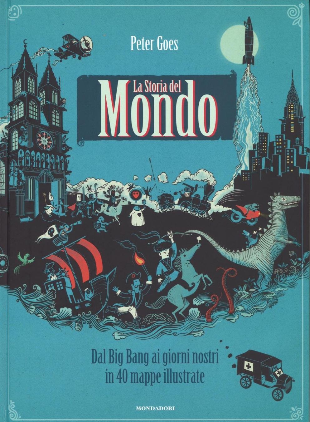 Diciamo che, a voler essere pignoli, il contenuto dell’opera avrebbe potuto richiedere una quantità tale di volumi che neppure la più grande biblioteca del mondo sarebbe stata in grado di contenerla. Peter Goes, invece, con incredibile e apprezzabile sintesi è riuscito in 80 pagine a guidare il lettore in un appassionante giro del mondo nello spazio e nel tempo, “dal Big Bang ai nostri giorni in 40 mappe illustrate” come recita il sottotitolo di La Storia del Mondo (Mondadori; 24 euro).