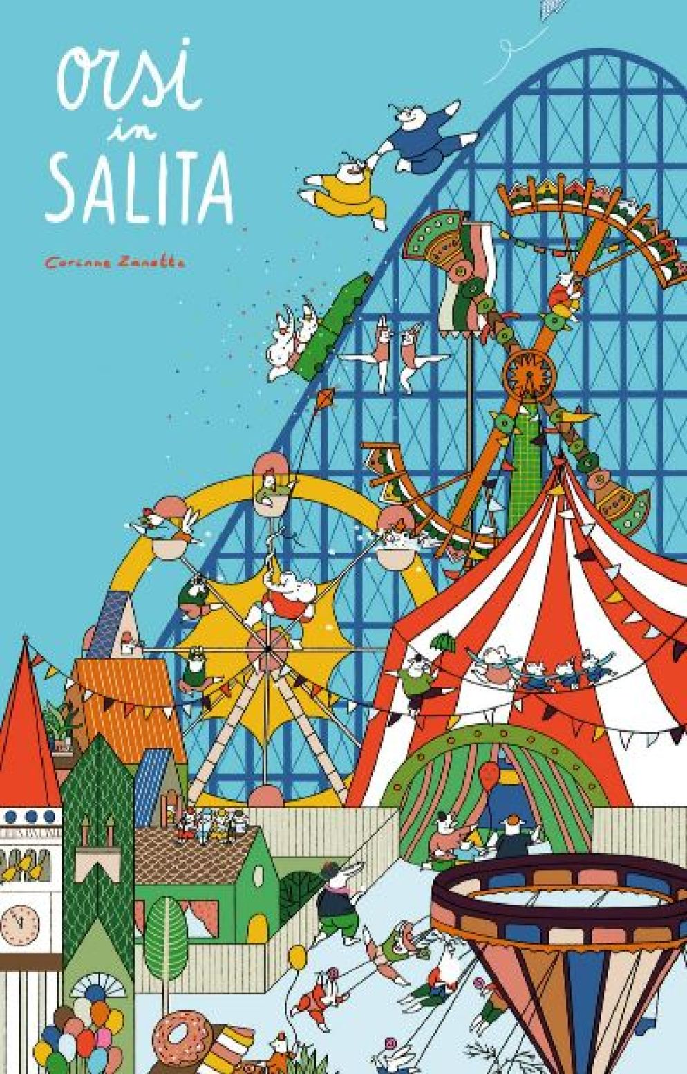 Gino e Gina due orsi allegrotti con gli occhiali se ne vanno scalando i tetti di una città popolata di animali, all’inseguimento di un aeroplanino di carta. E già questo è un incipit folgorante di una storia movimentata, con una moltitudine di personaggi che vediamo all’opera nelle più diverse situazioni, dentro e fuori le case. In questo che possiamo a buon diritto definire un coloratissimo albo affresco, un silent book wimmelbilderbücher, brulicante di storie da inseguire, oltre a quella di Gino e Gina, e mille dettagli da scoprire. Il formato particolare, stretto e alto, permette di osservare in ogni doppia pagina i protagonisti (tutti ritratti e presentati per nome nei risguardi) indaffarati diversamente in una continua salita. Dai tetti e attraverso le attrazioni di uno scatenato lunapark, i nostri due orsi - in compagnia di mucchette, conigli, maialini galli e galline, elefanti, gatti e topolini – salgono e salgono sempre più in alto, scalando montagne russe e ruote panoramiche, grattacieli da cui si vedono gli interni abitati e poi colline e montagne. Finché il cucuzzolo è raggiunto e… la sorpresa come sempre in ultima pagina. Dai 3 anni