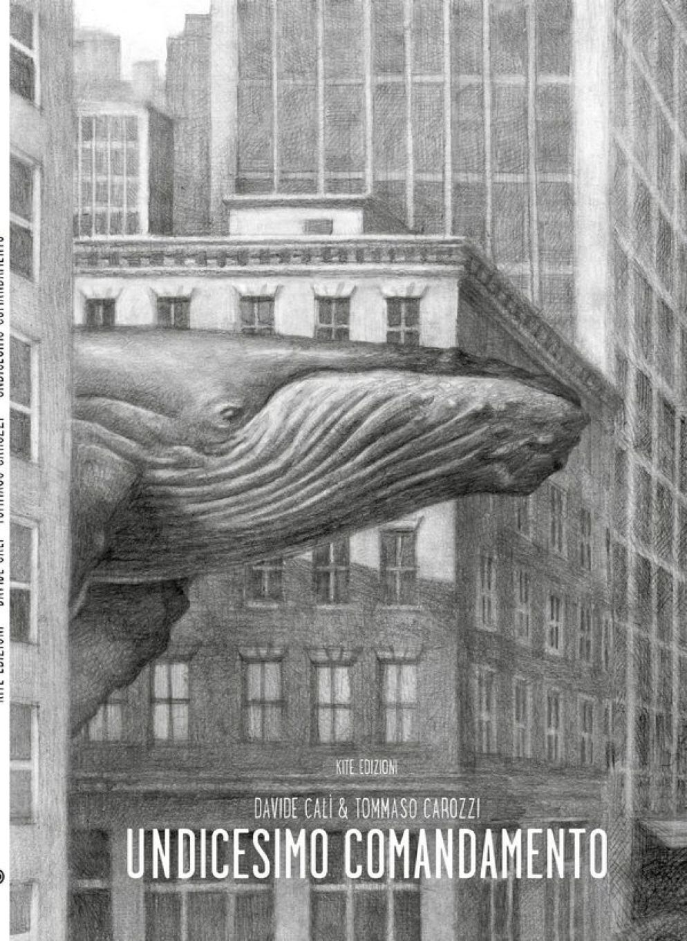 Davanti alla copertina di questo silent book firmato da Davide Calì e Tommaso Carozzi per le edizioni Kite (18 euro) il pensiero corre a quell’invasione di rane e ranocchi prefigurata da David Wiesner in “Di Martedì”. Undicesimo comandamento però adotta atmosfere più fosche e inquietanti, con le tavole nei toni del grigio realizzate a matita,per raccontarci l’invasione massiccia di decine di balene e capodogli che solcano i cieli della affollata e trafficata metropoli ( citazione evidente) di Melville.