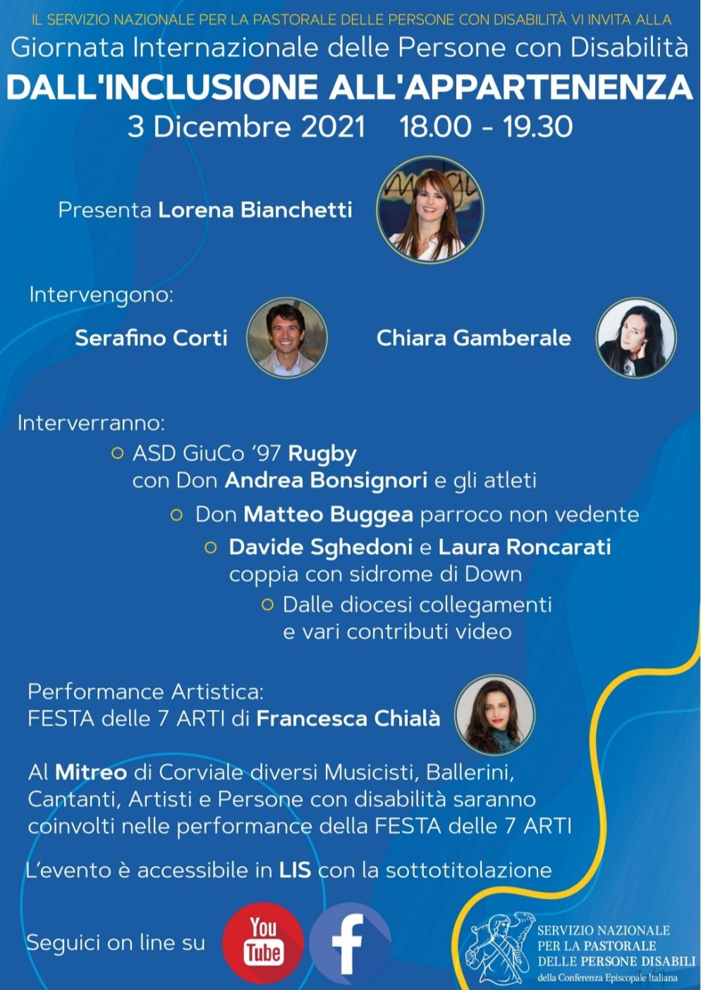 È possibile seguire in diretta streaming sui canali YouTube e Facebook della Cei l’evento organizzato dal Servizio nazionale per la Pastorale delle persone disabili per oggi dalle 18 alle 19.30, nella Giornata internazionale delle persone con disabilità. Al Mitreo di Corviale, a Roma, è in programma la «festa delle sette arti» con «musicisti, ballerini, cantanti, artisti e persone con disabilità» coinvolti in diverse performance. Presentati da Lorena Bianchetti, intervengono Serafino Corti e Chiara Gamberale. È prevista la partecipazione dell’Asd ’97 Rugby con don Andrea Bonsignori e gli atleti, di don Matteo Buggea, parroco non vedente, di Davide Seghedoni e Laura Roncarati, coppia con sindrome di Down. Collegamenti dalle diocesi faranno conoscere altre storie ed esperienze. L’evento è accessibile in Lis con sottotitolazione.