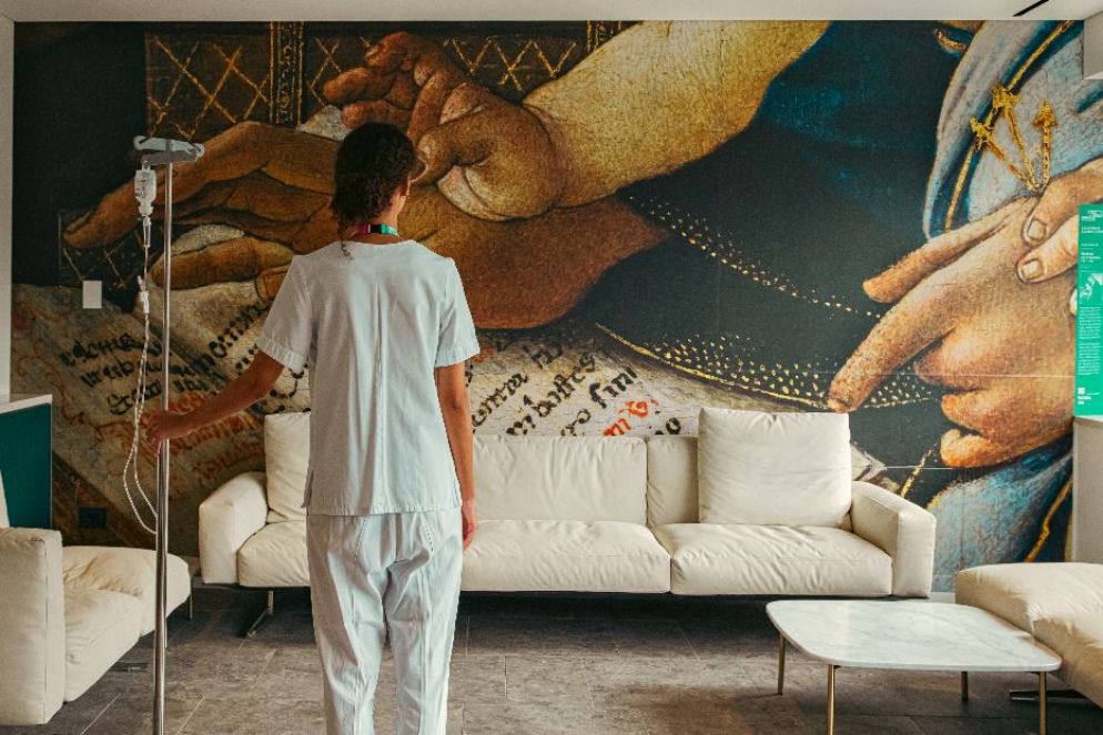 Dettagli di capolavori esposti al museo scelti per il loro significato e ingranditi per gli arredi interni al “San Pio X”. Da Botticelli ad Hayez protagonisti con i tra ambulatori e spazi comuni