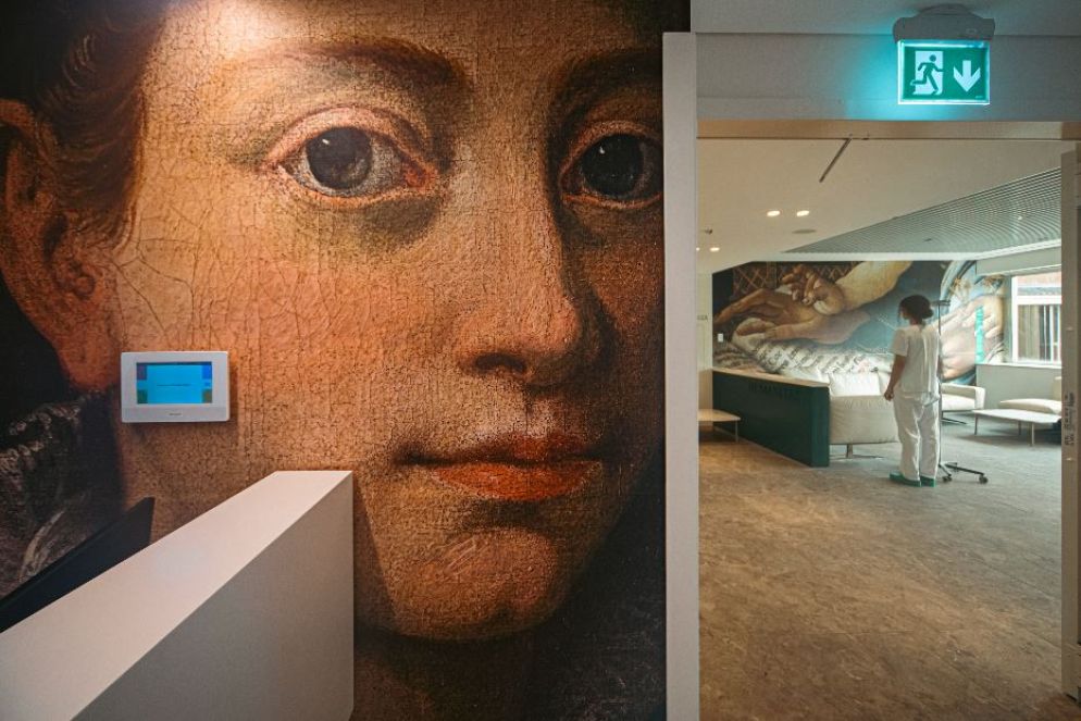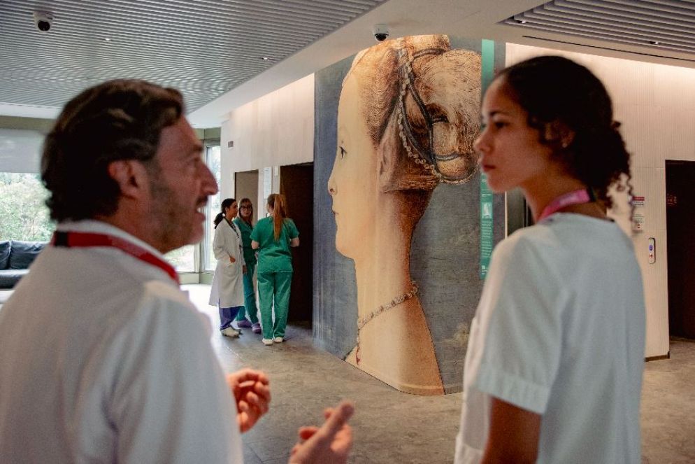 Sono 12 le opere d’arte selezionate: di ciascuna, è stato scelto un dettaglio significativo, riprodotto ingrandito sulle pareti ospedaliere. L’arte esce così dal suo contesto per accompagnare l’attesa e la permanenza in ospedale di pazienti e caregiver, ma anche per rendere più accogliente il luogo di lavoro per i professionisti dell’ospedale. E così, il volto rassicurante del Ritratto di dama del Pollaiolo accoglie i pazienti all’ingresso dell’ospedale; un dettaglio del volto del Ritratto di donna di Giovanni Martinelli accompagna chi si dirige verso l’area di Radiologia e Radioterapia, dove le mani della Madonna e dell’Arcangelo Gabriele, tratte dall’Annunciazione del Sassoferrato, fanno sentire al sicuro chi aspetta il trattamento.